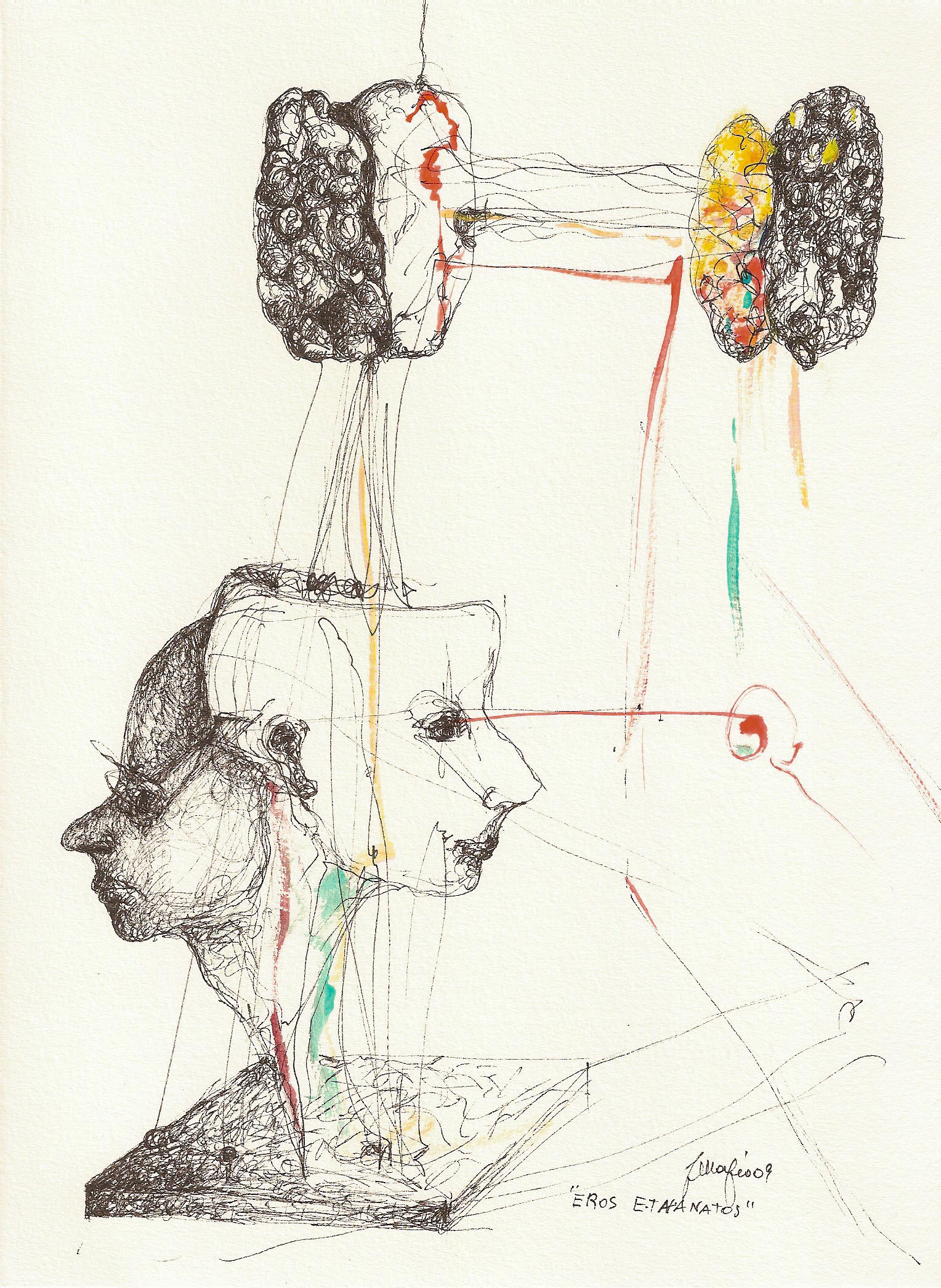 In alcuni casi, nei suoi lavori interviene un elemento geometrico che non appartiene a quel mondo di forme ovoidali, anzi, ne è l’opposto: si tratta di triangoli. Questi a volte sembrano frecce con la punta verso l’alto come ad indicare a chi guarda un punto di osservazione, altre volte sono protagonisti del racconto, come nell’opera “concepimento” in cui il triangolo potrebbe alludere all’organo sessuale femminile. La stranezza sta però nel fatto che la sua punta è verso l’alto anziché verso il basso e quindi con un riferimento più di dinamismo e slancio e movimento da giù a su che contraddistingue l’elemento maschile. Il triangolo, però simboleggia anche la trinità, è spesso nell’arte barocca è raffigurato anche con all’interno un occhio che è l’”occhio di Dio”, utilizzato anche nella simbologia massonica come occhio veggente. Ritorna pertanto questa componente barocca. Nell’universo della Magro, più femminile che maschile, quel triangolo può essere a volte l’uomo, a volte la forza che muove che appartiene più al divino che all’umano, che allude a Dio e al suo potere sull’uomo di governare la vita, le cose e il mondo.