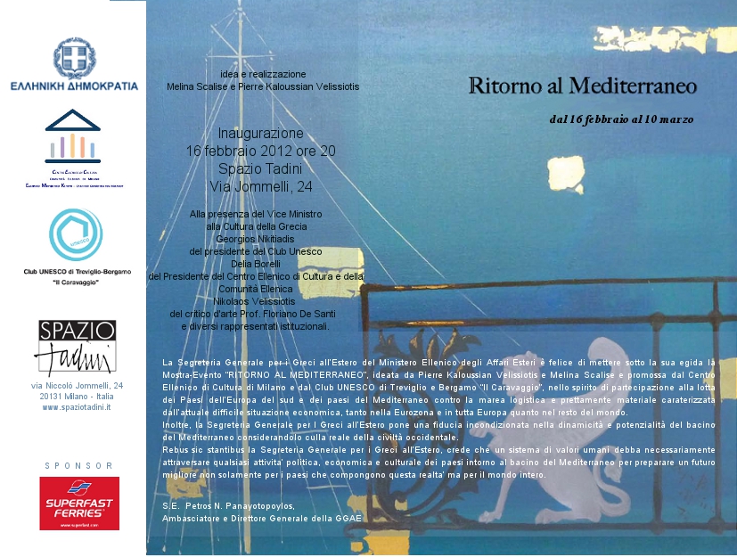 A Spazio Tadini abbiamo deciso di organizzare la mostra “Ritorno al Mediterraneo” per avviare, partendo dall’arte, un confronto interculturale e sociale finalizzato a conoscere e cercare ragioni e prospettive future. In questa logica non si poteva che partire dalla Grecia, così vicina a noi per cultura, e luogo caldo della crisi finanziaria in atto. Un ponte tra due Paesi, Italia/Grecia, che ancora una volta nella storia, in memoria dei tempi dell’impero greco-romano, condividono uno stesso bisogno: ripensare al futuro dando viva voce a tutti coloro che credono che i cambiamenti economici non possono prescindere da cambiamenti culturali e politici.