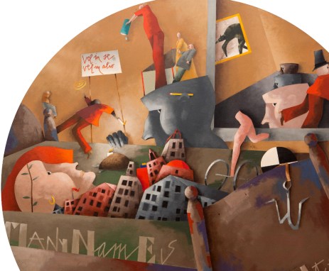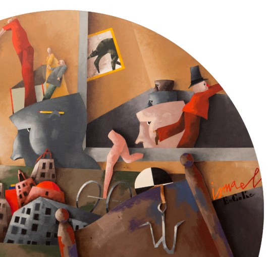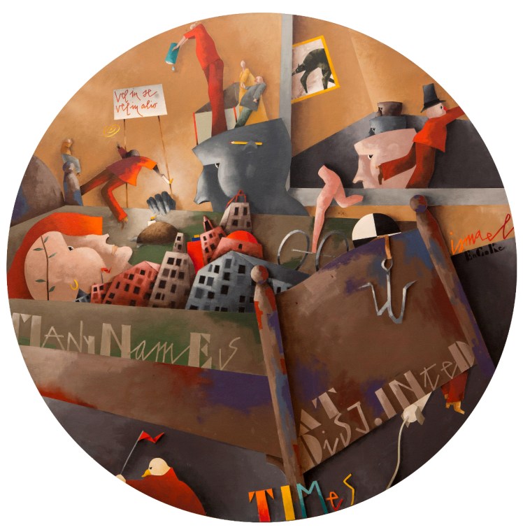 La grande tela tonda scelta da Tadini per “La camera da letto”, così come quella del romanzo di Joyce diventa dunque lo spazio in cui si sviluppa il racconto esistenziale di ognuno di noi come inseriti in un eterno presente.