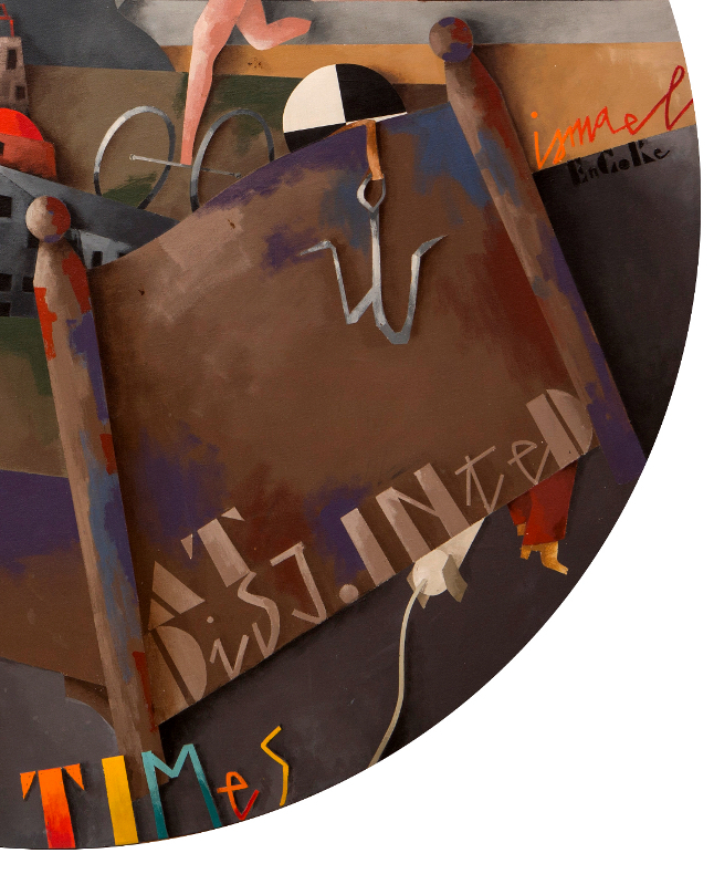“Il pensare per immagini resta fuori dalla parte cosciente” , scrisse Tadini sottolineando un passaggio di Freud nel libro “L’Io e l’Es”. Oppure,“TIMes” gioca con l’Io e l’Es perché “T” potrebbe essere iniziale di Tadini, una sorta di firma del quadro e così diventa : Tadini “ Im” – ovvero io sono – es. Questa terza interpretazione sembrerebbe una forzatura, in realtà non è così se si legge uno scritto di Tadini che spiega “nella totalità, prima della separazione, non si da quantità. Si da soltanto “qualità”. E questo rende in realtà indefinibile con parola il significato della parola qualità. Forse la qualità “è” proprio l’indicibile (il non separabile dalle parole), il ricordo di un fondamentale valore pre-verbale. L’occhio non fa che misurare distanze”. E a ore 6 troviamo la forma più in primo piano del quadro, la gamba-lancetta del letto-culla: l’inizio, il tempo della qualità, dell’es tanto che nella numerologia il 6 è il sogno, il destino e l’armonia.