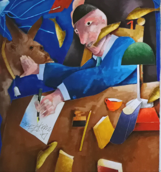 Questo personaggio emblematico del trittico di Tadini compie due gesti: con una mano (la sinistra) scrive e con l’altra sposta lo sguardo della testa di un animale che somiglia a un cavallo/asino. La mano destra e sinistra hanno una simbologia legata alla lettera Y ovvero alla biforcazione tra il bene e il male o, come nel mito di Enea, era biforcuto il ramo d’oro con cui poteva andare nell’Ade. Come vediamo dunque sembrerebbe non casuale la scelta di Tadini di far scrivere Perseo con la mano sinistra: lui è un personaggio che unisce due dimensioni. Con la destra, Perseo scosta lo sguardo di un cavallo/asino con al collo una campana che sappiamo tutti indicare, se indossata da un animale, l’utilità di essere ritrovato dal pastore quando non è visibile. La campana, però, è anche simbolo dello scandire del tempo e di momenti di passaggio come dalla vita alla morte. Siamo di fronte a un cavallo – Medusa che porta la morte con la visione (pensate al fatto che noi possiamo vedere solo ciò che è materiale e solo ciò che è materiale muore), ma dalla cui uccisione esce un cavallo alato, Pegaso, che si eleva dalle cose terrene e questa riflessione nel contesto dell’opera e della sua narrazione è straordinaria. Tuttavia, l’animale dipinto nel quadro di Tadini somiglia anche ad un asino. Che cosa potrebbe significare questo? L’asino è colui che porta il peso dell’uomo e, nel Vangelo, porta prima la Madonna e poi di Gesù.