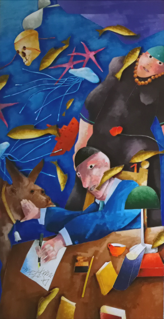 Osservando il quadro scoprirete la straordinaria corrispondenza di questo racconto mitologico con la prima tela del trittico di Emilio Tadini. Perseo è il personaggio seduto allo scrittoio con alle spalle la madre, di cui riconosciamo il sesso femminile e il suo ruolo materno in quanto ha un seno scoperto come una madre che allatta. I due personaggi sono inseriti in un contesto sottomarino presagio di morte, c’è un teschio, una nave che affonda ed è l’ambiente in cui sono stati gettati da Argo Acrisio, il padre/nonno, ovvero il mare, per scongiurare la sua morte per mano del nipote. Ciononostante quello che doveva essere per Danae e Perseo luogo di morte si presenta come un ambiente pieno di vita ci sono le stelle (quelle marine), i pesci, le meduse e, sopra la testa del personaggio femminile è dipinto un mezzo che somiglia più ad un aereo che ad una nave con la sua elica. Si tratta di un mezzo di confine che gioca nell’ambiguità del blu che è sia il cielo, luogo del visibile, che l’abisso, luogo dell’invisibile. Perseo e sua madre sopravvivono alla tragedia e riemergono dall’abisso. E’ singolare come noi usiamo spesso espressioni come il baratro, l’abisso, il fondo, quando vogliamo indicare una situazione di estrema difficoltà tanto quanto usiamo l’espressione “venire a galla” , “saltar fuori” quando ritroviamo una cosa nascosta o persa.