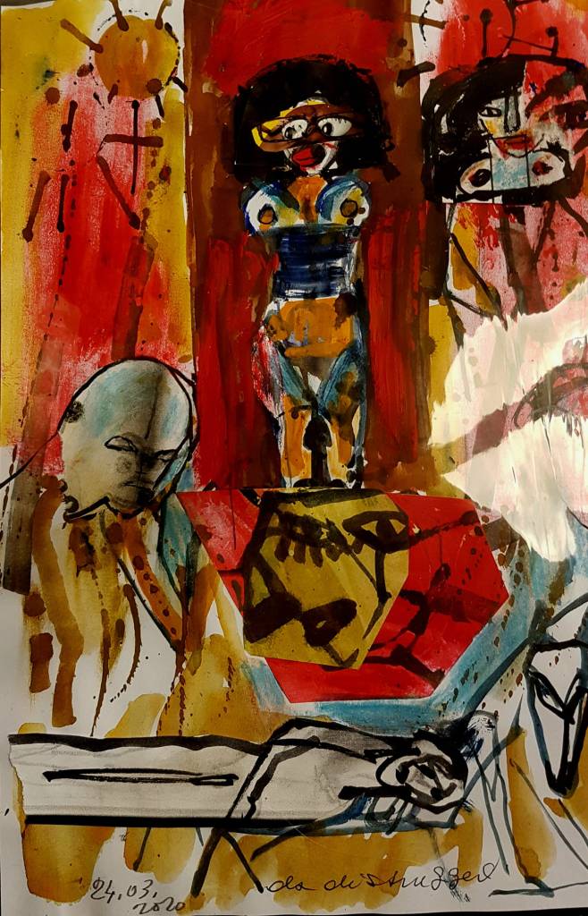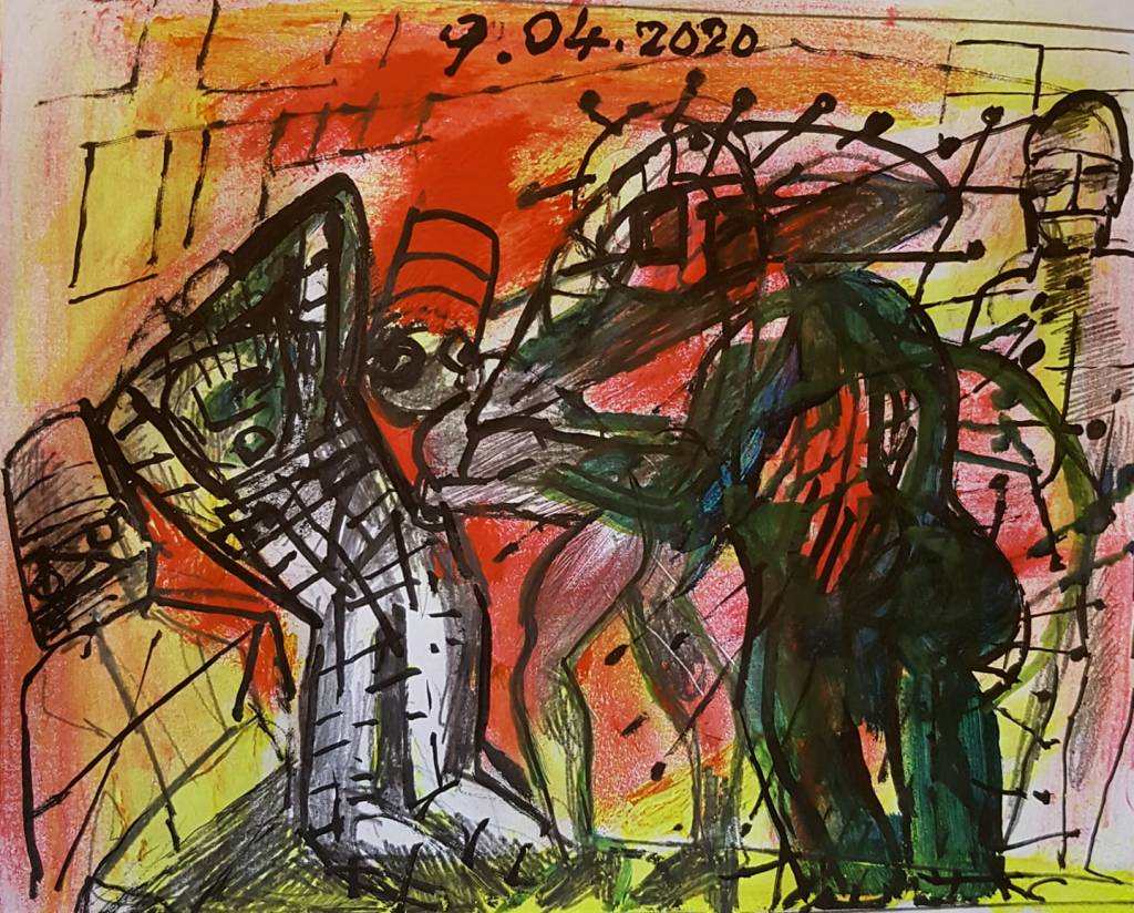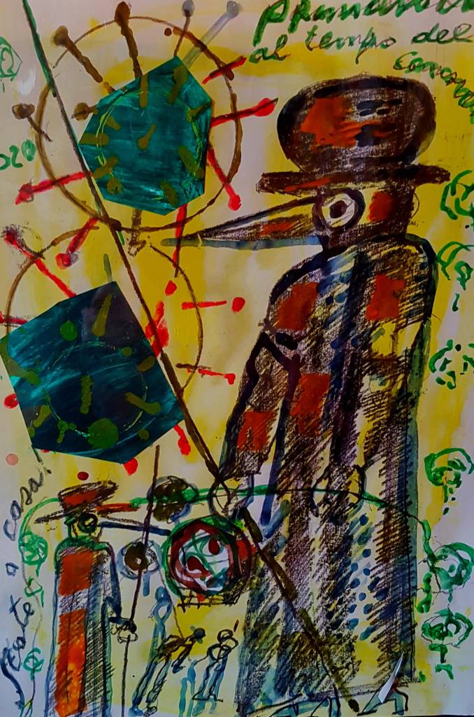 Per questo artista, figlio della prima metà del 900, la pandemia da Covid 19 è diventata l’urgenza di raccontare la sua e la nostra battaglia quotidiana contro questo nemico venuto a seminare morte tra gli uomini, non senza porre una riflessione in chiave iconografica e simbolica. Sono dei lavori in simultanea, in diretta, una cronaca giornaliera di emozioni e considerazioni.