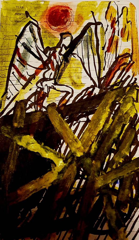 Ebbene il sacro in queste opere è la vita stessa, è la vita dell’uomo, non quella dei santi. Qualcuno, sembra dirci Ferrari, ci guarda, come nell’opera che cita Armageddon, o quella in cui angeli sterminatori e diavoli entrano nello spazio dell’uomo e lo sconvolgono. Invadono le case e capovolgono – non a caso – la figura femminile che è sempre presente nei lavori di Ferrari. Lei, personificazione anche della Natura è raffigurata sempre vicina alla vita, ma in questi disegni e dipinti sembra perdere il suo potere fecondante. Si presenta costretta in un busto fino al seno e violentata da diavoli e si trasforma nel simbolo dell’alto potere riproduttivo del virus che uccide.