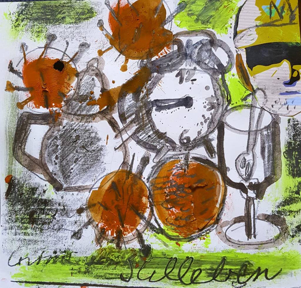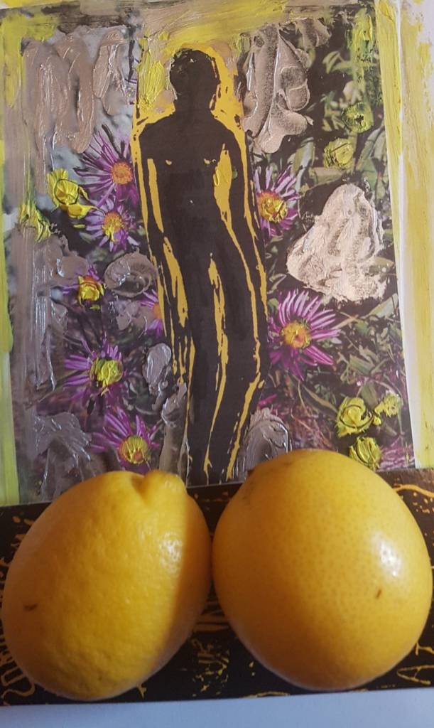 Noi, gli uomini con il nostro mondo mortale al di quà, mentre da qualche altra parte la vita va avanti nella sua sacralità. Ferrari propone, anche in questa serie, alcune opere con la natura morta dove ricorrono i teschi, ma anche dei limoni. Singolare, in particolare, l’opera con i due limoni in primo piano che, come su un altarino quattrocentesco, sono posti a simbolo di amore e salvezza riferiti alla sagoma dell’uomo che soccombe inerme alla pandemia come se fosse corpo sacro.