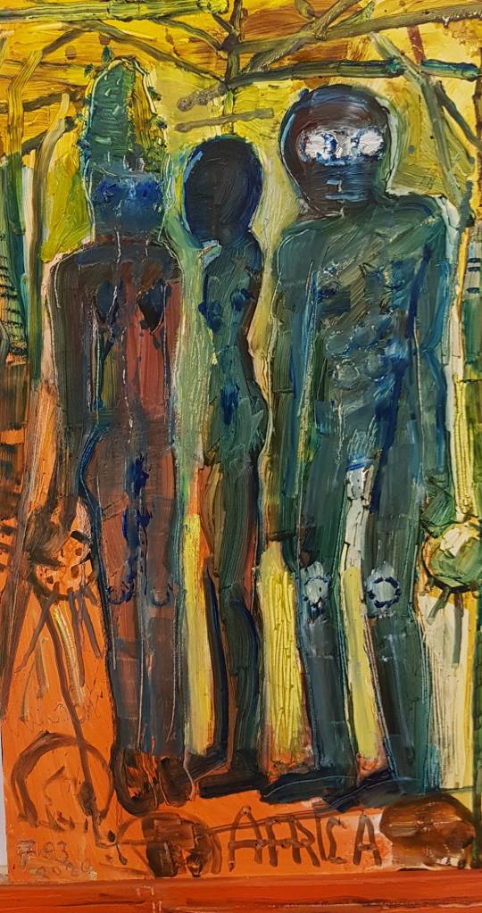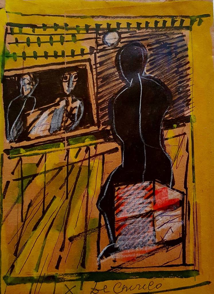 E’ una pittura impegnata quella di Ferrari. Un lavoro che non cerca “il bello” armonioso, ma vuole rappresentare il mondo con le sue contraddizioni e contaminazioni. E’ un mondo che è fatto di fuori e di dentro ovvero del reale e dell’elaborato interiore che, a sua volta, lo modifica. In questo momento pandemico l’onirico prende il sopravvento, l’uomo è nella sua casa, nell’ombra, lontano dagli altri, in un suo mondo che rischia di inghiottirlo e, metaforicamente, è lontano dalla luce, da quella luce che entra solo dalle finestre. Ed è così che lo dipinge Ferrari, seduto, contemplativo, inerme, passivo.