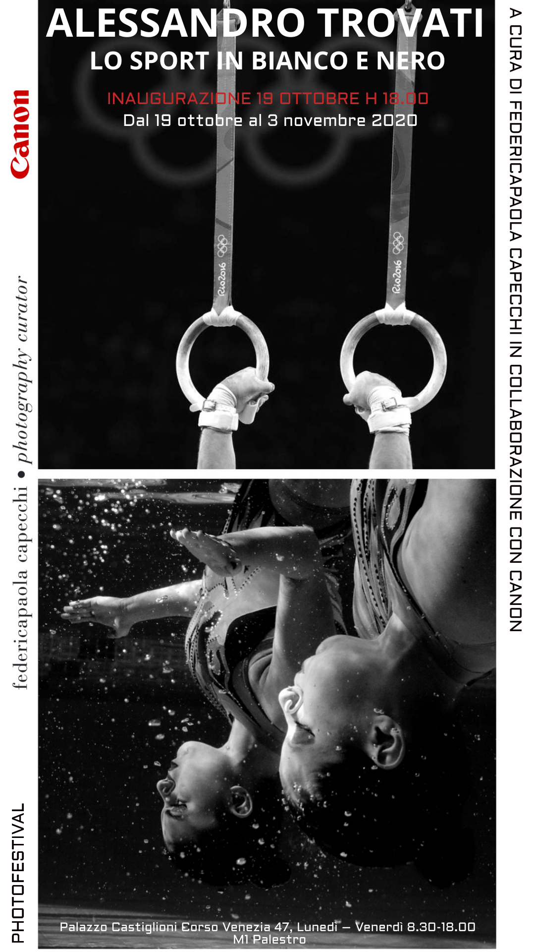 “Siamo lieti di essere al fianco di Alessandro Trovati in questa mostra dalle tinte chiaro-scure, che rivelano la bellezza e la perfezione di grandi gesta sportive. Valorizzare il talento e supportare i professionisti del mondo dell’imaging, che con i loro scatti raccontano storie incredibili, è per noi un impegno imprescindibile.” Afferma Paolo Tedeschi, Senior Manager Corporate and Marketing Communications di Canon Italia “Alessandro Trovati, Canon Ambassador da ormai diversi anni, ha vissuto al nostro fianco l’evoluzione tecnologica senza precedenti che ha contraddistinto la storia del nostro brand, della rivoluzione di EOS 5D Mark IV fino alla nascita di EOS R System. Oggi continuiamo a vivere, come sempre insieme, il potere della fotografia spingendo i confini del possibile sempre più in avanti. Come gli Atleti dei suoi scatti, puntiamo a nuovi traguardi, a performance straordinarie e soprattutto, a vincere.”