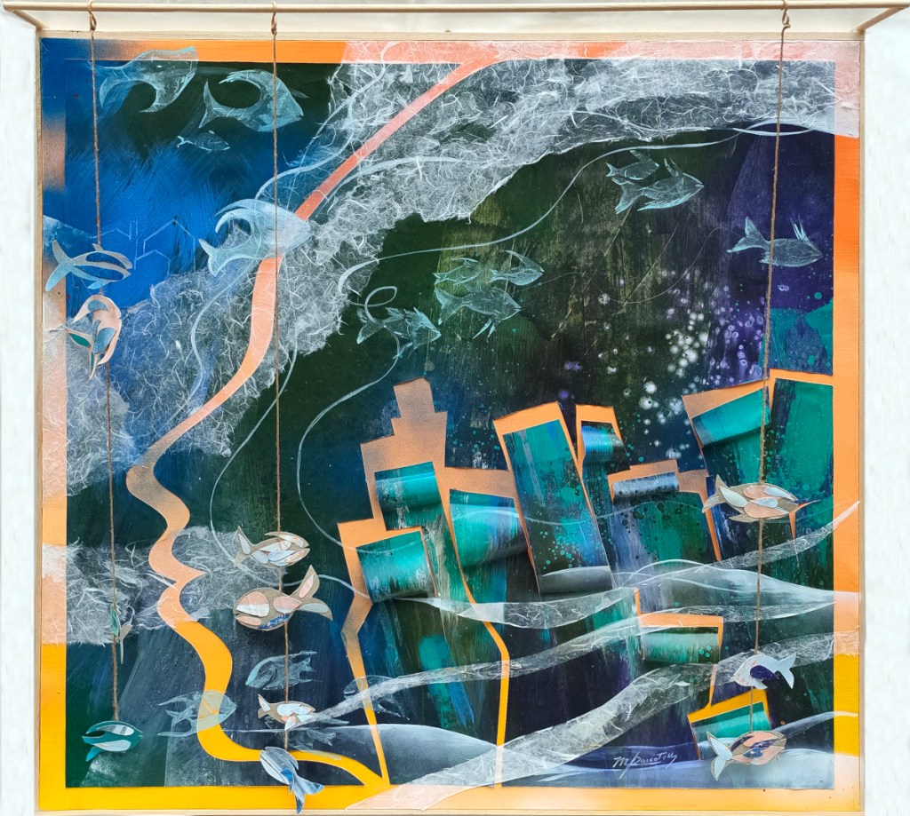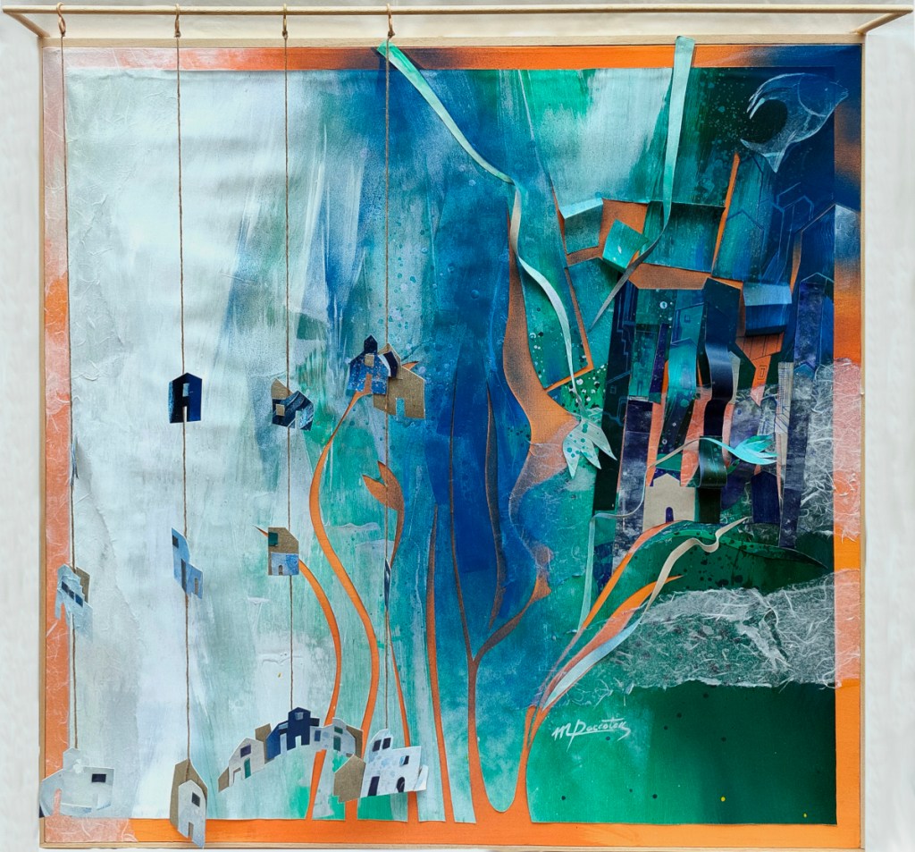Oggi ci sentiamo un po’ tutti pesci fuor d’acqua, le nostre certezze vacillano come le case appese a un filo nei lavori di Roccotelli, ma questo destino è lo stesso dei pesci che appartengono ad un mondo diverso dal nostro: siamo tutti dipendenti gli uni dagli altri. Ora sta a noi scegliere come navigare e agire. Interessante è il modo in cui l’artista ci invita al fare, al gesto perché permette allo spettatore di interagire con l’opera cambiando la posizione di case e di pesci. Cos’altro è se non un invito all’azione? E’ lo stesso impulso che lei stessa esprime nella sua frenesia di “fare arte” e scrive: “..non posso ancora fermarmi” e solo così spero di riuscire a raggiungere o ad avvicinarsi all’ideale, all’Arte con la A maiuscola che paragona al “respiro”.