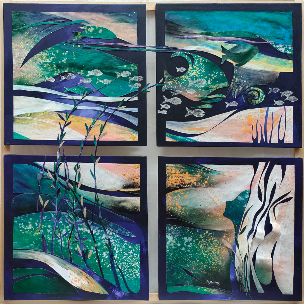 Scrive sul suo lavoro Mariuccia Roccotelli in “Ricami e ritagli”: “Tela su tela, ricami e ritagli della più tradizionale delle superfici. La pittura diventa taglio, il segno del pennello non basta più: è come scolpirla la pittura. Il caso si sovrappone al razionale, al misurare minuziosamente il peso degli elementi: pesci, onde, alberi, profili di donna che guardano la luna, paesaggi urbani e mondi sommersi, immersi, profondi. Perché non solo pittura? Mi interrogo sul motivo per cui dedico ore ed ore ad un gesto sartoriale. Sto creando decorazioni o posso considerarla Arte? Arte è la meta, la ricerca è certamente infinita. Forse non c’è un punto di arrivo, dimentichi tutto e basta vivere il divenire, basta esserci nel percorso che fai, per raggiungere il punto più vicino a quella meta. Nell’ ideale l’Arte è bianco, puro e semplice, è pathos, è respiro; in questi lavori c’è tanto, troppo racconto, lo so, ma… non posso ancora fermarmi…”