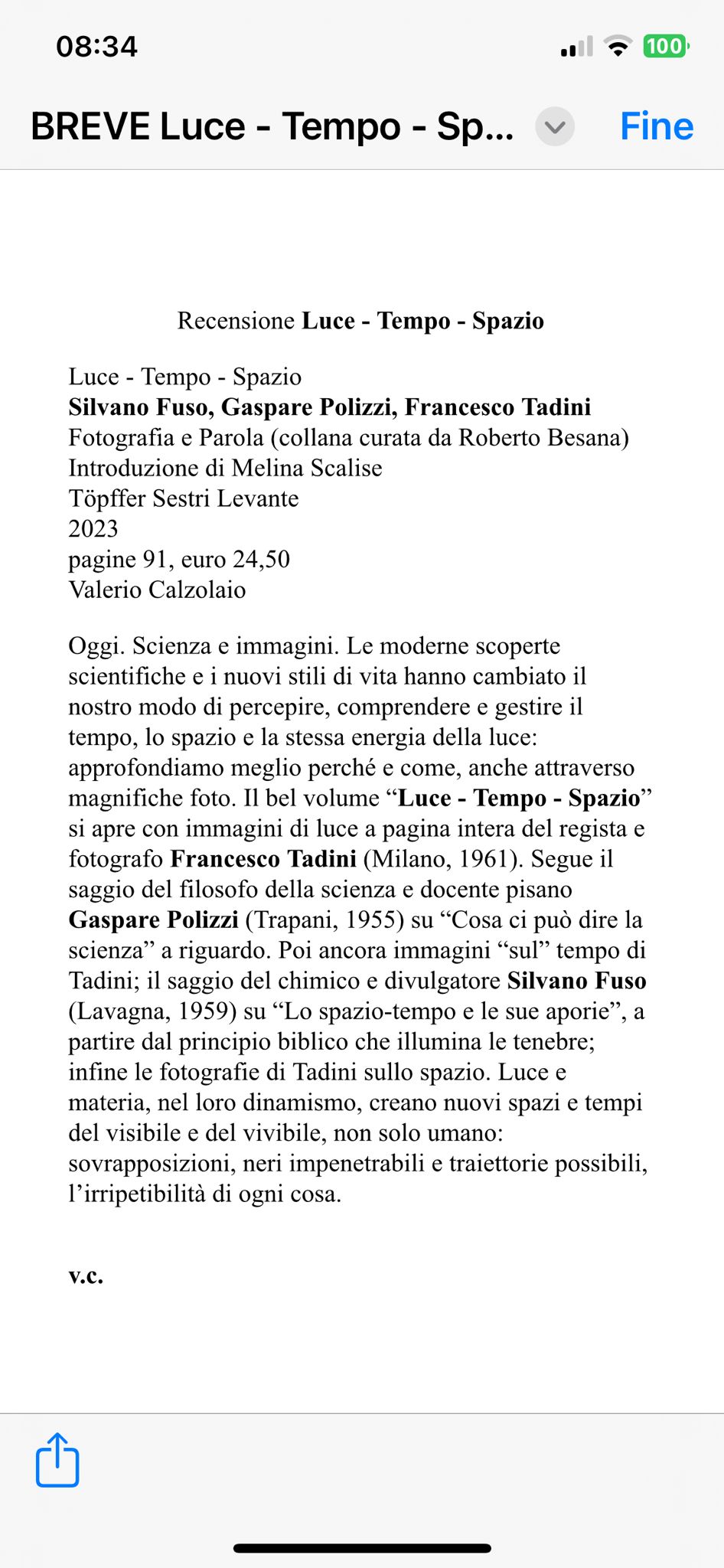 Cosa sono il tempo, lo spazio e la luce oggi? Le moderne scoperte scientifiche e i nuovi stili di vita hanno cambiato il nostro modo di percepirli e gestirli. L’opera propone spunti di riflessione su questi argomenti attraverso gli scritti di Silvano Fuso, che ne affronta gli aspetti scientifici, e quelli di Gaspare Polizzi che ne indaga gli aspetti filosofici. Parole che dialogano con le fotografie di Francesco Tadini, che pratica il mosso controllato ovvero trascina la luce nello spazio nel momento dello scatto giocando sui tempi di esposizione. Un risultato che evoca un tempo retinico della visione, ovvero quello che si manifesta prima ancora dell’intervento razionale che naturalmente ricerca il conoscibile e rassicurante immobilismo della forma. Troverete dunque riflessioni e immagini, parole e figure che offrono al lettore, nel silenzio della lettura e della visione, la proposta di un ritmo al nostro pensare, un tempo. In qualche modo assecondiamo quanto auspica il filosofo Polizzi nel suo breve saggio panoramico sul pensiero filosofico legato al tema, come al cospetto del nostro tempo frettoloso oggi si abbia bisogno di “ritegno”; intendendo con questo la necessità dell’Uomo contemporaneo di “prendersi tempo” in un contesto sociale dove tutto corre in fretta. Silvano Fuso, nel suo saggio, ci fa riflettere sul “principio” biblico in cui tutto ebbe inizio portando la luce nelle tenebre. Fa notare come spazio e tempo non vengano neppure citati, come se fossero semplicemente scontati o consequenziali. Questo conferisce alla luce un ruolo primario e indispensabile; un susseguirsi di spunti che portano ad Einstein e alla sua rivoluzione del pensiero scientifico, parlandoci dell’inevitabile interazione di spazio e tempo con la materia: In parole povere la materia “dice” allo spazio-tempo come curvarsi, e la curvatura dello spazio-tempo “dice” alla materia come muoversi”.