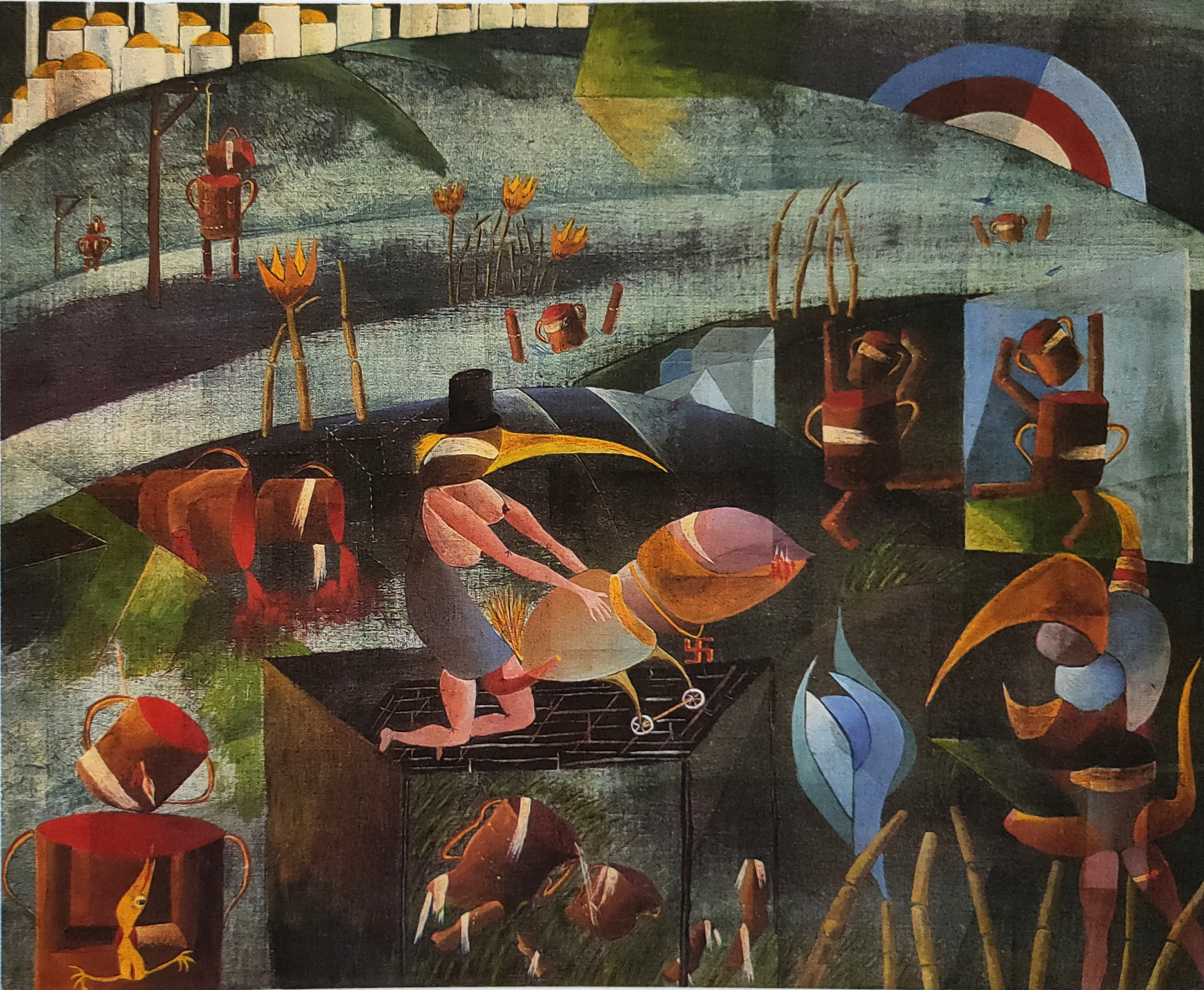 RASSEGNA STAMPA – Leggo la cronaca di questi giorni di Quaresima, dove Trump viene ritenuto, dalla sua responsabile dell’Ufficio della Fede della Casa Bianca, paragonabile a Gesù, sommo questo alle immagini dove un Capo di Stato si fa filmare e fotografare afflitto, ma senza croce, attorniato dai suoi uomini come in un dipinto dell’Ultima Cena e vedo, sempre la responsabile dell’Ufficio della Fede esaltare i suoi “fedeli” in abitino giallo….Penso che il giallo non sia un colore adatto per chi in quella Fede ci ha perso la vita promuovendo la fratellanza, l’uguaglianza. Dove sono finiti i marroni, i grigi o i bianchi dei preti? Quelle “uniformi” che uniformavano ai colori della Terra, dell’Humus comune, dell’umiltà? Nella casa dove il “bianco” aveva avuto un senso ora troviamo cravatte rosse, scarpe oversize, cappelli per non far vedere gli occhi, abiti gialli per professare la “fede” da un’ape regina che riporta parole con il presunto fine di ricordare l’unica fede “legittimata per difenderla da un potenziale nemico”. Il mondo è sempre più o di quà o di là. O pro o contro, dimenticando che tra noi e l’altro c’è sempre uno spazio di margine ed è l’unico dove si possono costruire i ponti.Allora rifletto e guardo questo saggio sul Nazismo di Emilio Tadini degli anni 60, un piccolo quadro, un’immagine criptica e scopro qualcosa che ci riguarda da vicino. In quella tela Tadini voleva esprimere una riflessione su cosa sia una dittatura fino alla sua espressione più crudele come è stato il Nazismo. Chiaramente Tadini aveva vissuto sulla sua pelle quel periodo storico, era sopravvissuto alle bombe. Ebbene, quel personaggio che sembra avere un amplesso con un essere mostruoso ci riconduce alla figura di Hermes (notate il cappellino? Ma anche il becco ha un suo nesso ancor più antico di comunicazione con il divino). Questa divinità è il messaggero degli Dei. La sua figura mitologica è associata al possesso di un iper-fallo. Dunque capisco che, in quel dipinto, le cose non stanno come appaiono: non c’è nessun altro all’infuori di lui.Ergo colui che si proclama messaggero degli dei è quello che si procura piacere da solo: ciò che sembra l’altro è invece una protesi, è il congegno che a lui serve per provare un piacere narcisistico, perverso.Forse proprio per questo la dottrina della Chiesa, insegnava che l’autoerotismo fa diventare ciechi: gli altri possono diventare anche inesistenti. Il tutto mentre gli altri credono di poter contare qualcosa perchè si sentono parte di un “tutto risoluto, punitivo verso i cattivi e per giunta espressione del divino”. Il prezzo di quella apparente sicurezza collettiva porta all’assenza della possibilità di creare, di vita.Vivere nella relazione è la cosa più difficile. Noi siamo figli di Caino che uccise suo fratello Abele. Ricordare cosa ci siamo raccontati nella storia dell’Umanità per gestire il male è obbligatorio. Non dobbiamo conservarne memoria (a quella ormai ci pensa l’AI), ma ri-cordo: tornarci con il sentimento.